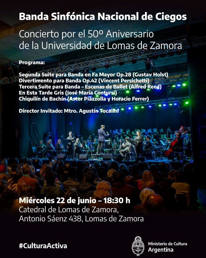 Actuo la Banda Sinfónica Nacional de Ciegos por los 50 años de la Universidad Nacional de Lomas de Zamora Con motivo del 50º aniversario de la creación de la Universidad Nacional de Lomas de Zamora, el miércoles 22 de junio habrá un concierto de la Banda Sinfónica Nacional de Ciegos “Pascual Gris...