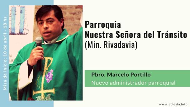 La parroquia Nuestra Señora del Tránsito (Ministro Rivadavia) recibió hoy a su nuevo administrador, presbítero Marcelo Portillo, en una misa que presidió esta noche el obispo diocesano, monseñor Jorge Lugones SJ.