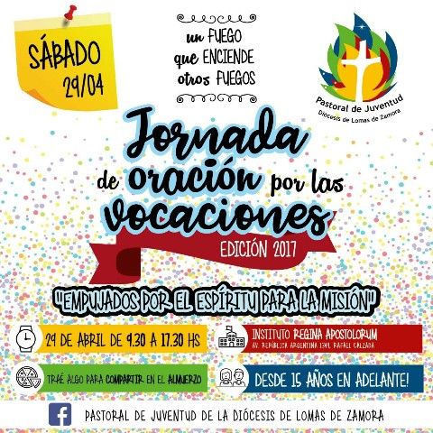 Como adelanto de la Jornada Mundial de Oración por las Vocaciones -que la Iglesia celebrará el 7 de mayo, “Domingo del Buen Pastor”-, la Pastoral de Juventud organiza este encuentro, el 29 de abril, para jóvenes mayores de 15 años en el colegio Regina Apostolorum (Rafael Calzada).