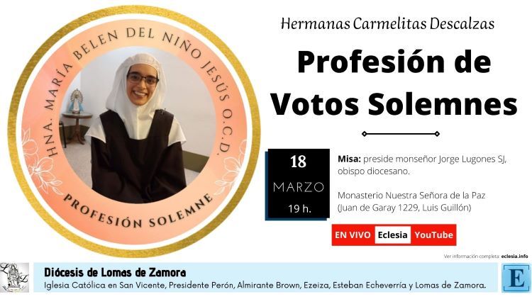 Las religiosas Carmelitas Descalzas de la diócesis de Lomas de Zamora celebrarán la Profesión de Votos Solemnes de la hermana María Belén del Niño Jesús O.C.D., en una misa que presidirá el obispo diocesano, monseñor Jorge Lugones SJ.